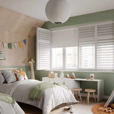 Our ‘two in one’ shutter and blind combination is ideal for Bedrooms. These shutters are provided with a pleated or roller blackout blind integrated into the framework, giving you extra versatility from this window solution. The shutter louvres can be adjusted during the daytime for light control and privacy, transitioning into nighttime easily using the blackout blind to mitigate light bleed through the shutter louvres. These shutters work particularly well for Nursery’s & Children’s Bedrooms as the blackout blind and shutter is compliant with Child Safety Laws.